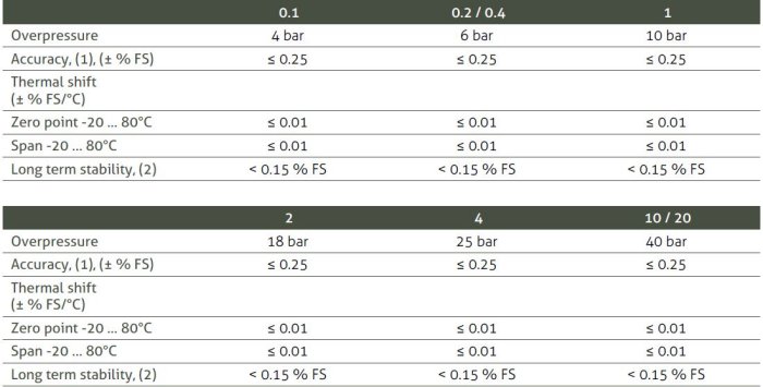 Pressure measuring range: 100 mbar … 20 bar. Accuracy: ≤ ± 0.25 % FS. Operating temperature: -25 … 85°C. Process temperature: -40 … 125°C. Output signal: 4 … 20 mA. Materials: Stainless steel.