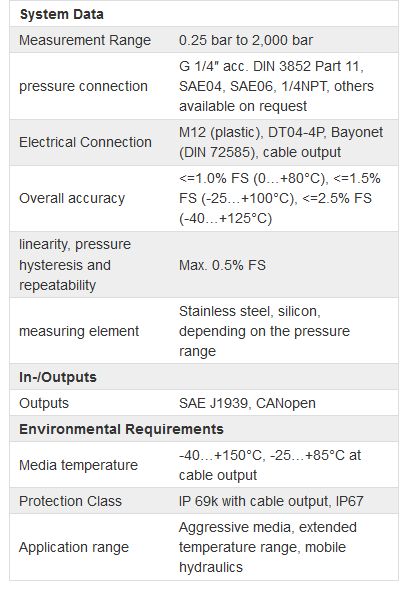 The M01-CAN is available in two different Versions. For pressure ranges of 0 … 0.25 bar there is a silicon sensing element, and for pressure ranges of 0 … 1,000 bar (up to 2,000 bar for common-rail applications) a welded thinfilm pressure cell is used. Depending on the sensing element, the max. permitted media temperature is 150 ºC / 302 °F and the ambient temperature is max. 125 ºC / 257 °F. An optional damping unit can be integrated into the media access.