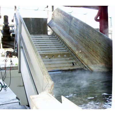 Scrapers for dragging the material are mounted on the chains with suitable attachments. The divert wheels and chains are both designed to be immersed in water. The chains exit the water in the final inclined section of the conveyor, although they may also exit at the take-up end on the opposite side. These conveyors are mainly used for cooling ash and boiler slag in water or for chemical processes (e.g. scraping slag from coal gasification plants). For this reason, the bottom end of the scrapers must be made of wear-resistant material (basalt, alumina or similar). The scrapers are generally in the form of a C-shaped profile lined with wear-resistant steel along the scraping ends.The required flow rate and hauling speed are generally low.