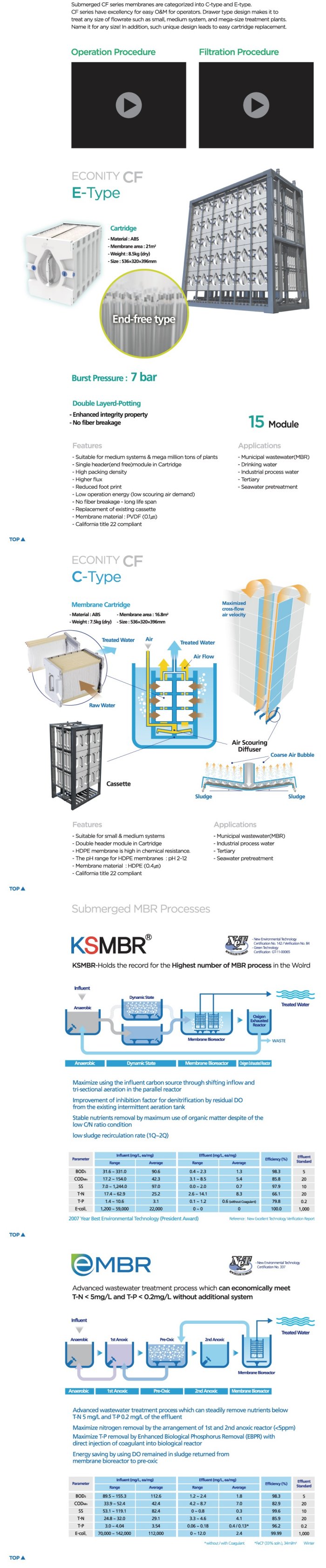Submerged CF series membranes are categorized into C-type and E-type. CF series have excellency for easy O&M for operators. Drawer type design makes it to treat any size of flowrate such as small, medium system, and mega-size treatment plants. Name it for any size! In addition, such unique design leads to easy cartridge replacement.