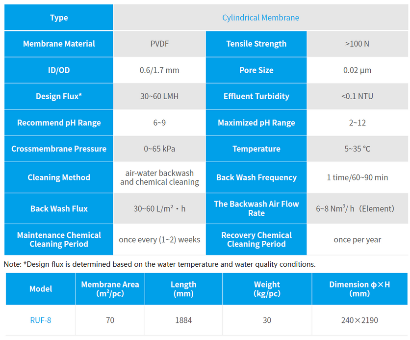 • Easy cleaning and maintenance: Due to composite hydrophilic modification technology, the membrane be preserved at dry state, and it is convenient to be stored, transported, cleaned and maintained;