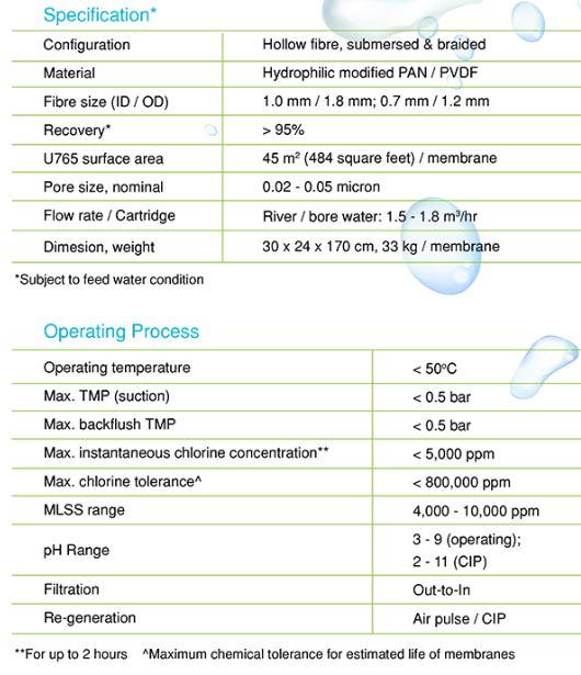 Operating filtrate flux 10-45Lmh. Peak operating flux 50Lmh. CEB chemicals NaOCI. CIP chemicals Citric acid or NaOCI.