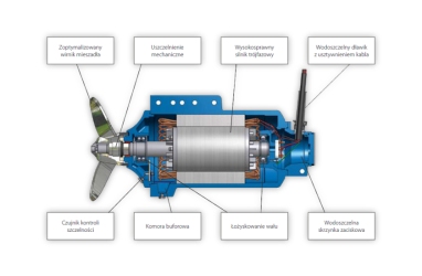 - 3-phase, 400 V, 50 Hz, protection IP68, insulation class F, bimetallic sensors installed in each phase, 10 m power cable, synthetic protective coating. Motor is cooled by the surrounding liquid.