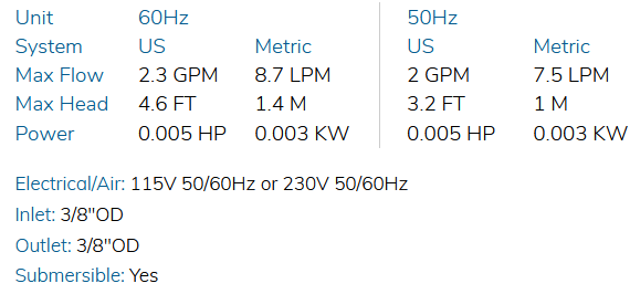 Summary ParagraphMarch Pump’s industrial 1A-MD-3/8 is an American submersible seal-less centrifugal magnetic drive pump. It is capable of generating a maximum flow of 2.3 gallons per minute at 0.25 feet, and its maximum head is 4.5 Feet (2PSI). The 1A-MD-3/8 pump may be used submerged or not submerged. The standard wet end (the materials that come into contact with the solution) is composed of Polypropylene, Buna N, Nylon, Carbon/Teflon, and Stainless Steel. When submerged, Epoxy, Noryl, and the SJT Cord are also in contact with the solution. The inlet connection is 3/8 inch smooth, and the outlet is 3/8 inch smooth. The standard motor is a 1 Phase 115V or 230V 0.005 Horsepower motor, which can be run on either 50 or 60 hertz (there are performance differences between the hertz options). The maximum internal pressure the pump can tolerate is 50PSI, and the maximum liquid temperature is 190 Fahrenheit or 160 Celsius in open air, or 87 Fahrenheit or 71 Celsius if submerged. The March 1A-MD-3/8 centrifugal magnetic drive pump is capable of handling fresh water, salt water, and mild chemicals. To determine if the March 1A-MD-3/8 is suitable for your application, please contact March Pump.
