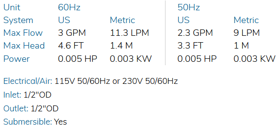 Summary ParagraphMarch Pump’s industrial 1A-MD-1/2 is an American submersible seal-less centrifugal magnetic drive pump. It is capable of generating a maximum flow of 3 gallons per minute at 0.25 feet, and its maximum head is 4.5 Feet (2PSI). The 1A-MD-1/2 pump may be used submerged or not submerged. The standard wet end (the materials that come into contact with the solution) is composed of Polypropylene, Buna N, Nylon, Carbon/Teflon, and Stainless Steel. When submerged, Epoxy, Noryl, and the SJT Cord are also in contact with the solution. The inlet connection is 1/2 inch smooth, and the outlet is 1/2 inch smooth. The standard motor is a 1 Phase 115V or 230V 0.005 Horsepower motor, which can be run on either 50 or 60 hertz (there are performance differences between the hertz options). The maximum internal pressure the pump can tolerate is 50PSI, and the maximum liquid temperature is 190 Fahrenheit or 160 Celsius in open air, or 87 Fahrenheit or 71 Celsius if submerged. The March 1A-MD-1/2 centrifugal magnetic drive pump is capable of handling fresh water, salt water, and mild chemicals. To determine if the March 1A-MD-1/2 is suitable for your application, please contact March Pump.