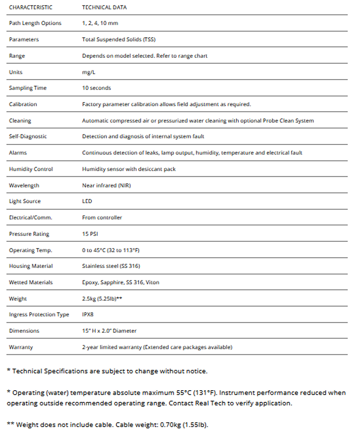 Real Tech’s robust TSS submersible probe provides affordable real-time measurement of changes in total suspended solids (TSS) and/or particle concentration in wastewater. Designed to meet the needs of many monitoring applications, the TA series offers multiple sensor path length selections for the desired measurement range.