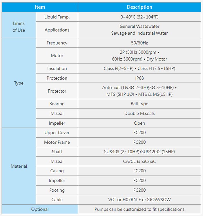 - Equipped with Auto-cut Protector, epoxy cable base treatment, double mechanical seals and lip seal design.