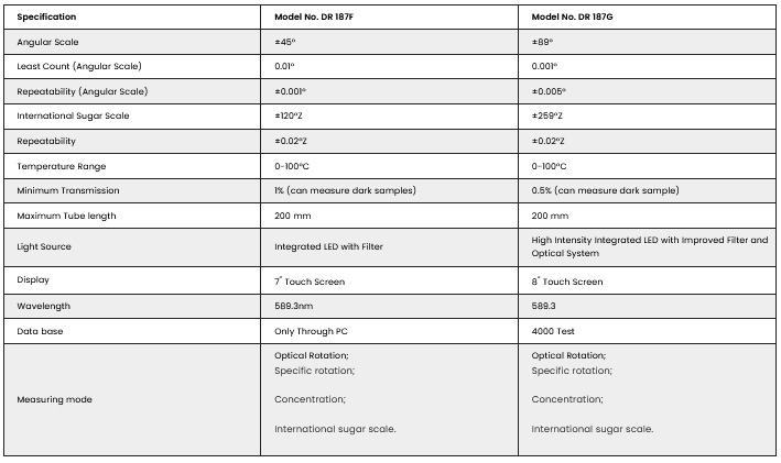 Automatic Polarimeter DR 187 F/G (Touch Screen). Monsanto. advanced digital circuit and microcomputer control. LCD display. Storage of Six times results for Re-M (repetition measurement) and Calculation average value. Measurement of dark-colored sample. The DR 187 G Automatic Polarimeter uses USB or RS232 and can be used for Measuring specific rotation, optical rotation sugar degree and concentration.