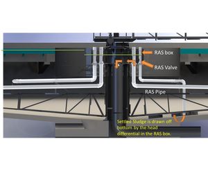Suction or draw-off pipes are equally spaced along the rake arm to draw off settled sludge across the clarifier. Blades on the rake arm are arranged in a “V” pattern to direct the collected sludge towards the Suction Pipe. A RAS valve, located in the RAS Box, on each individual suction pipe allows the flow from each pipe to be adjusted to optimize the solids removal from the clarifier leading to potential higher RAS concentrations.