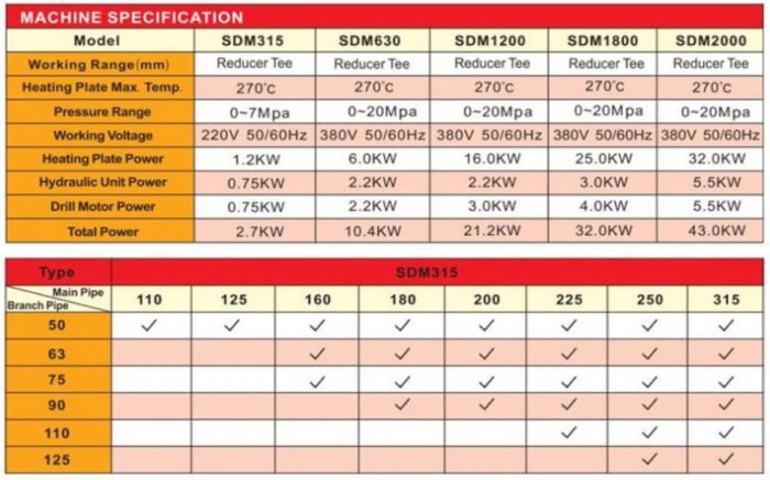 Suitable for fabricating PE reducing tee in a workshop. Integrated function of wdlding and taping enables to complete the whole fabricating process. Removable PTFE coated heating mould. Separate two-channel timer records times in soaking and cooling phases. Digital high-accurate pressure meter indicates clearer readings. Linear guide ways are equipped with heating plate and dragging plate. PLC control available for automatic process to ensure high welding standard. Wide range of application to improve machine usage.