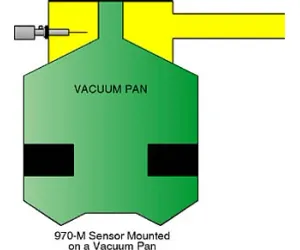 The 970-M utilizes the time-tested method of measuring temperature of vapor leaving the pan as the best indication of massecuite concentration at the upper surface. Since it is at the lowest temperature within the pan, it is at the point of highest oversaturation. This is proven as the one method capable of indicating unsafe oversaturation levels throughout the entire course of the boiling cycle.