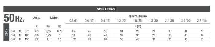 Rewindable. Motor upper bracket: nickel plated cast iron. Pump body and delivery head: nickel plated cast iron. Impeller: stamped brass. Motor case: SS 304. Motor shaft: SS 304. High quality radial and thrust ball bearings. Winding: enameled copper – Class F insulation. Degree of protection IP68/Class B insulation. Max temp. 35° with water cooling flow min. 0.08 m/s. Max depht immersion: 150 m. Nos. of start per hour: max 30 at regular intervals. Mechanical seal: graphite/ceramic. Coolant: dielectric non toxic high quality lubricant. Pump cable length: 10m (3 wires plus ground). Voltage variation: +/-10%. Single phase motor pump available in both version CSCR & PSC. Suitable for horizontal operation.