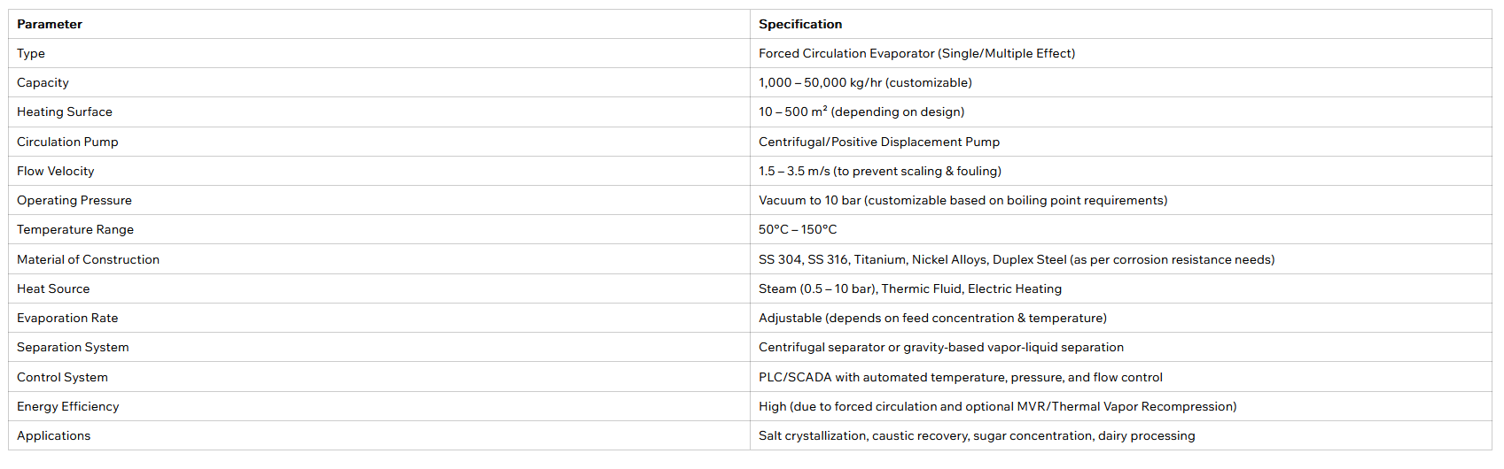 The forced circulation evaporator uses a pump to circulate liquid through steam-jacketed tubes at high pressure created to prevent boiling.