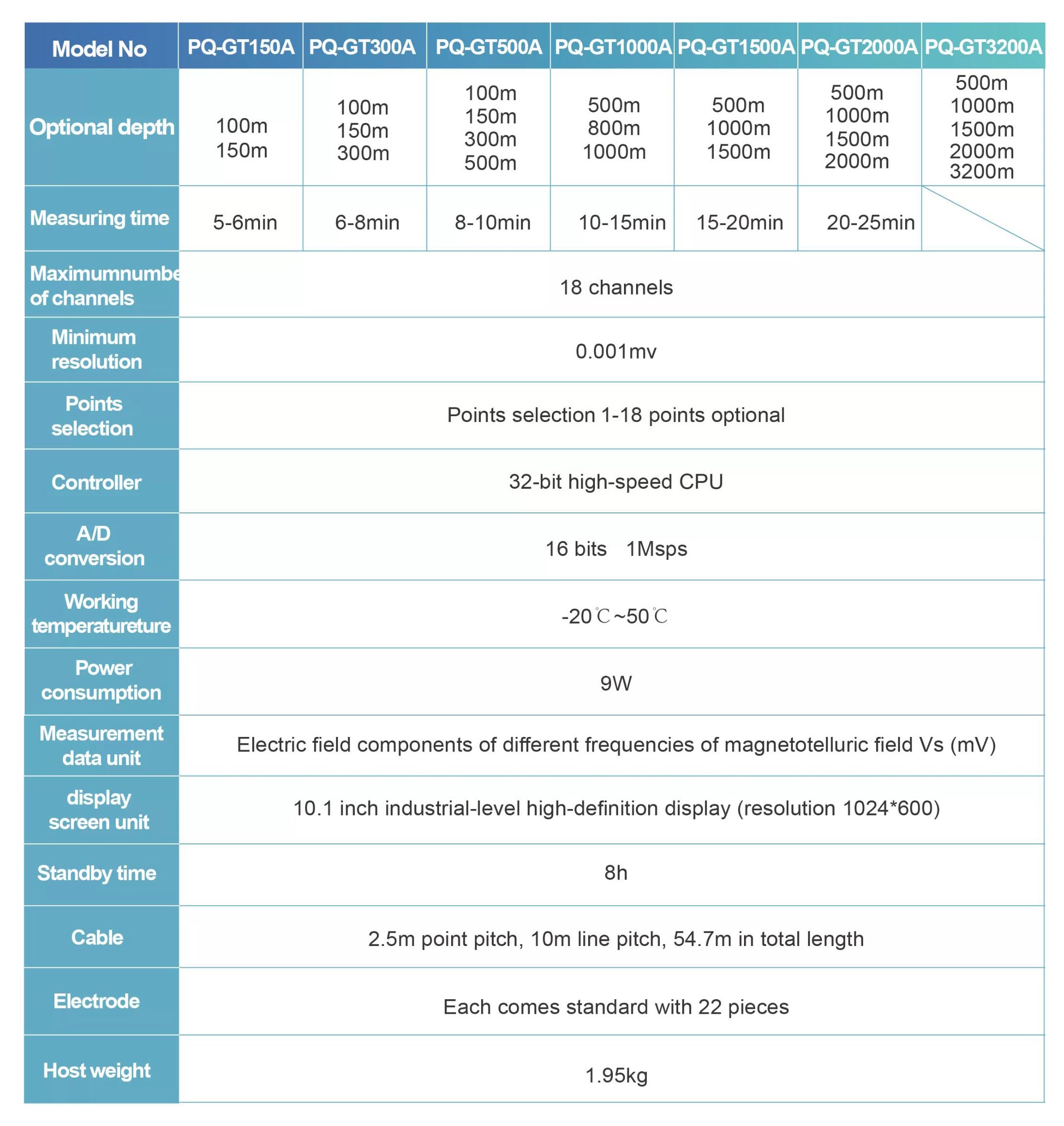 This series of instruments integrates 5 independent invention patents of PQWT, including data acquisition system, data processing system, automatic mapping system, automatic analysis system and circuit system. It realizes the simultaneous data acquisition of multi-channel and multi-frequency, completely solves the influence of unstable factors caused by the time difference of the natural electric field source, and greatly improves the accuracy and work efficiency. The instrument can process the collected data, automatically draw curve map, profile map, and 3D renderings in real time, and automatically analyze abnormal areas, so as to provide scientific basis for analyzing geological structures quickly and effectively.