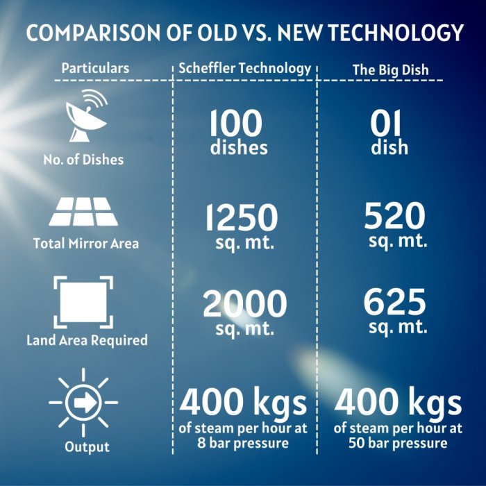 Sunrise CSP also offers Scheffler Dishes for smaller process heat plants and as a low-cost entry point to solar thermal solutions. With a 16 m2 mirrored surface, Scheffler Dishes are a modular and scalable system that grows in 5kW-thermal units and is ideal for applications that need as little as 5kW-thermal up to 300kW-thermal. The lightweight of Scheffler Dishes means they can be mounted on flat roof tops and terraces. Typical applications include community & institutional: cooking, thermal water desalination, space heating / cooling and refrigeration. For applications needing more than 300-kW thermal then we recommend the Big Dish to reduce the system footprint, O&M costs and increase efficiency, thereby significantly lowering the cost of energy delivered for larger applications.