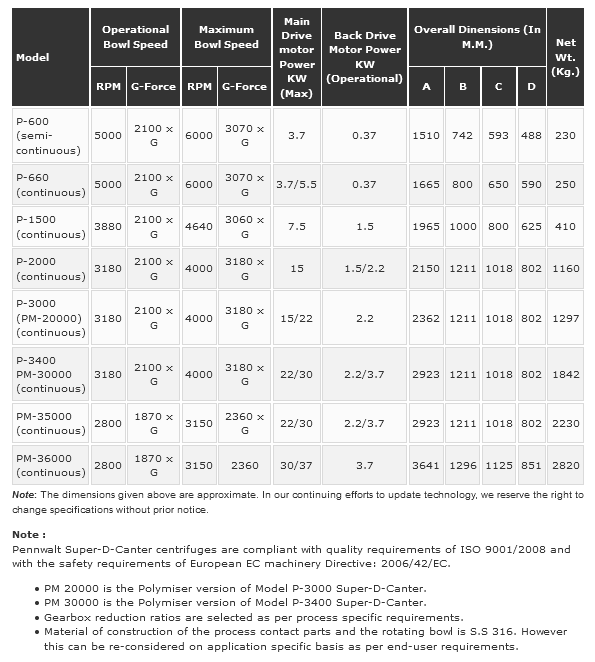 Pennwalt Ltd. are manufacturers of Decanter Centrifuge Models P600, P660, P1500 P2000, P3000/PM20000, P3400/PM30000, PM35000 and PM36000 based on the technology acquired from Sharples Stokes Division Pennwalt Corporation-USA.