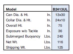 Features Super-tough white LLDPE shell. Ultraviolet inhibited. Completely urethane foam filled. Virtually unsinkable. Self-righting without tackle. Replaceable white vinyl wrapper. Standard bands, symbols, messages included. 11⁄2" sch. 40 galvanized pipe through buoy. 10" dia. galvanized steel plate at top (can).