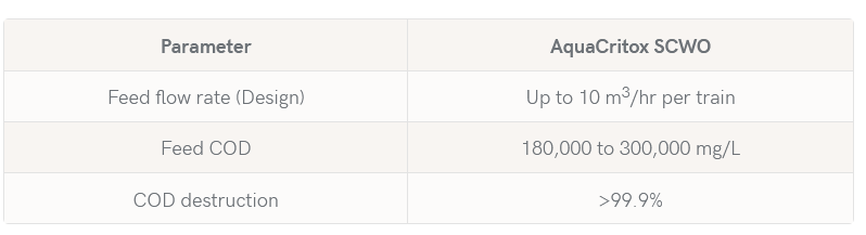 The treated effluent from the AquaCritox® SCWO will be free of COD, odour, and colour. When processing sewage sludge the effluent will contain a phosphate-rich ash suitable for recovery. The table above indicates expected effluent quality relating to specific feed conditions.