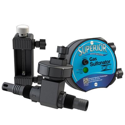 The SUPERIOR Series SD-1 Gas Sulfonator is a state-of-the-art, vacuum-operated, solution feed type which mounts directly on a sulfur dioxide cylinder valve. The sulfonator is mounted onto the sulfur dioxide cylinder valve using a very heavy-duty, positive yoke clamp connection. A sulfur dioxide gas flow meter panel indicates the amount of sulfur dioxide being fed and may be located wherever it is safest and most convenient. Sulfur dioxide flow rate is manually adjusted and the design permits easy addition of a number of automatic flow rate control devices. A high efficiency, water operated ejector produces the vacuum necessary to operate the system. The ejector assembly contains a back-flow check valve system to prevent pressurized water from entering the sulfonator. A spring-opposed diaphragm vacuum regulator controls the sulfur dioxide gas flow rate and also acts as the safety shut-off valve.