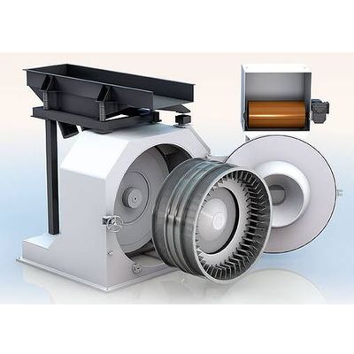 A vibrating trough feeds the incoming material into the heavy-particle separator. The separator sorts out not only heavy particles but ferrous metals as well. The material for milling is then drawn into the centre of the milling chamber and fed into the milling track in the air flow.