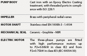 Suitable for use with clean water that does not contain abrasive particles and with liquids that are not chemically aggressive towards the materials from which the pump is made. Because of their reliability and the fact that they are easy to use and are economical, they are ideal for domestic use and in particular for distributing water in combination with small pressure tanks and for the irrigation of gardens and orchards. The pump should be installed in an enclosed environment or sheltered from inclement weather.