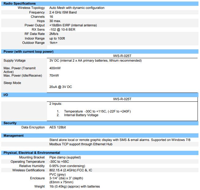 The Intelligent Wireless System (IWS) nodes comprise of a range of distributed wireless products from Plexus Controls providing advanced supervisory, control and data acquisition (SCADA) functionality for commercial and industrial applications. With `out the box` auto mesh wireless functionality, IWS nodes can be easily installed at a remote location and connected to standard sensors, supporting 4-20mA, 0-5V, 0-10V, HART, temperature, pressure and many other interfaces. Either through a direct wireless connection or automatically hopping through a series of repeater IWS nodes, the sensor data is relayed back to the IWS Hub for termination over Ethernet to the IWS Management Server application for display, logging and alarm management.