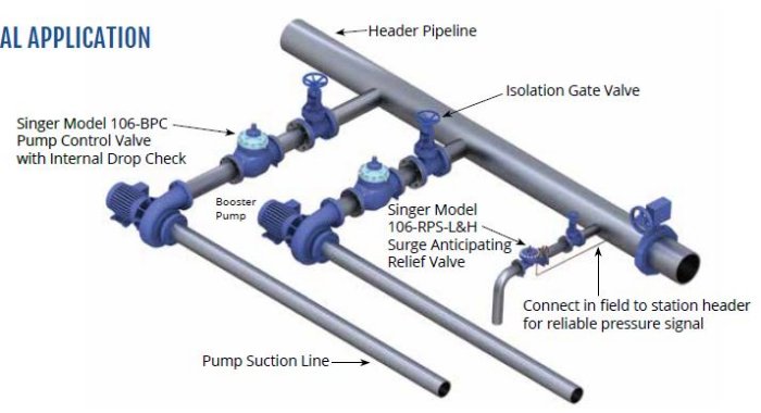 The 106-RPS-L&H and 206-RPS-L&H anticipating surge relief valves are based on the 106-PG or 206-PG main valve. The valve is mounted in a tee, downstream of the pump check valve(s). It is designed to anticipate surges to avoid the severe water hammer often associated with power failure surges.