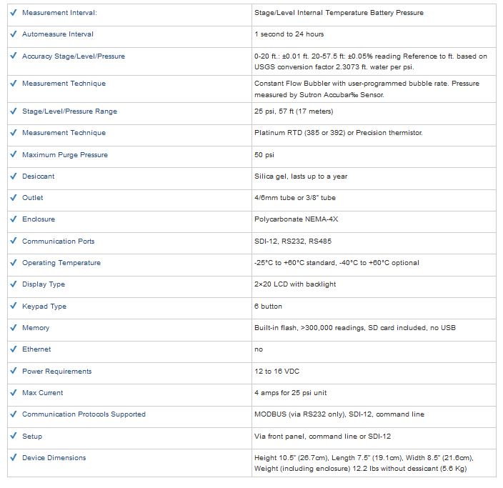 The Compact Constant Flow Bubbler (Part #56-0133-25-1S), 50% smaller than Sutron’s original Constant Flow Bubbler, is a self-contained, precision device to measure water levels & temperature. It consists of a pump, tank, manifold, control board, display/keypad & enclosure. The new Compact CF Bubbler houses all components within a 10.5”x 8.5”x 7.5” polycarbonate NEMA-4X enclosure. An optional external desiccant is available. The Compact Constant Flow Bubbler’s built-in precision Accubar® Pressure Sensor meets the high accuracy requirements for stream gaging & monitoring of tidal/coastal areas, estuaries, groundwater & reservoirs. The Bubbler includes a built-in datalogger for stand-alone operation and/ or backup (redundant) data recording and RS232 and SDI-12 ports for communications and maintenance. The front panel includes a display and keypad. It also supports MODBUS.