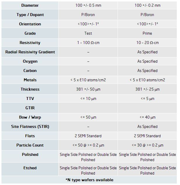 SVM carries a full line of 100mm wafers. Please see below a SEMI standard specification for prime and test grade wafers. Every customer’s specification is unique and SVM can supply wafers that meet your exact specifications.