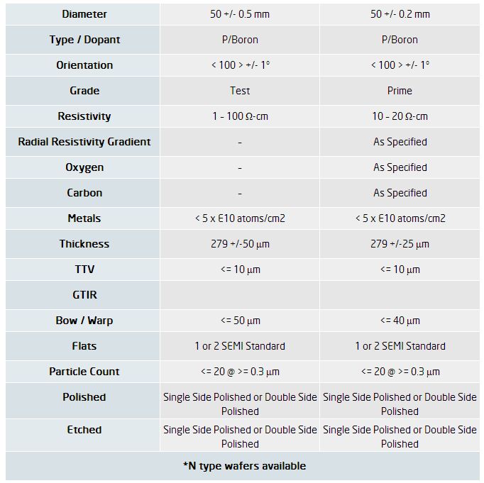 SVM carries a full line of 50mm wafers. Please see below a SEMI standard specification for prime and test grade wafers. Every customer’s specification is unique and SVM can supply wafers that meet your exact specifications.