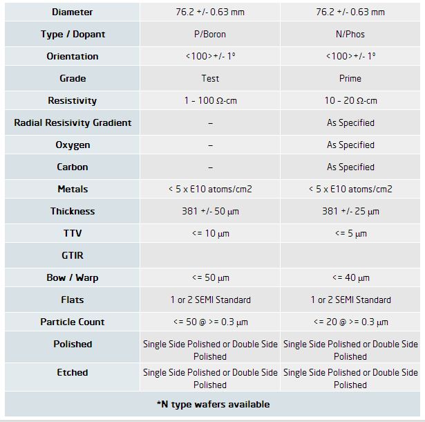 SVM carries a full line of 76mm wafers. Please see below a SEMI standard specification for prime and test grade wafers. Every customer’s specification is unique and SVM can supply wafers that meet your exact specifications.