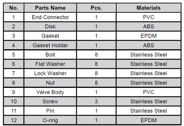 All Valves Pressure & Leak Tested. 0-150 P.S.I .Heavy Duty Injection Molded Gray PVC Material. Stainless Steel Assembly Bolts & Flap Pin. EPDM Gaskets for Positive Seal.