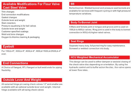Flour Valve sleel check valves are designed and manufactured to provide maximum service life and dependability All check valves meet the design requirements of the American Petroleum Institute standard. API 800 and API 6D. British Standard BS EN 13709 and generally conform to the American Society of Mechanical Engineers standard ASMEB16.34.