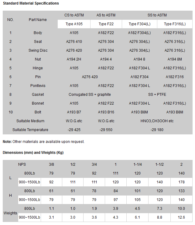 Swing Check Valve 800Lb~2500Lb. Note: Other materials are available upon request.