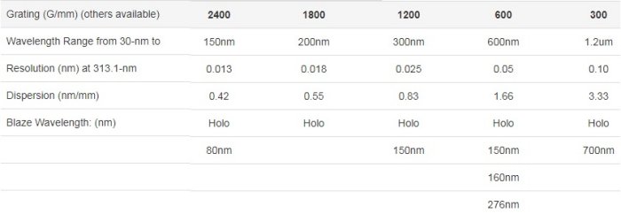 - Wavelength Range : refer to grating of interest for range