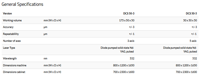 The machine uses linear motor driven X-, Y- and Z-axes (DCS 50-3) with additional B and C rotary axes enabling accurate diamond machining such as blocking and shaping (DCS 50-5).