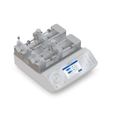 The Fusion 4000X is a motorized, multi-channel syringe infusion pump. It features a dual-independent channel infuse and withdraw syringe pump. It is built with 2 separate pump drives capable of independent pulseless, reproducible rates, and movement. Programmable multi-step and cycle mode that allows users to input complex flow profiles or perform flow cycling from a computer Labview or the pump itself. This motorized multi-channel syringe infusion pump system also can be expanded with a 2-syringe push and pull rack attachment to increase the total syringe capacity to four. Designed for a wide range of biopharmaceutical research like lipid nanoparticles, microfluidic mixing, and lab-on-chip flow control in drug formulation applications; with an all-glass touch screen and precision machined metal design, the Fusion 4000-X dual-channel syringe pump is easy to clean, for lab and GMP environments.