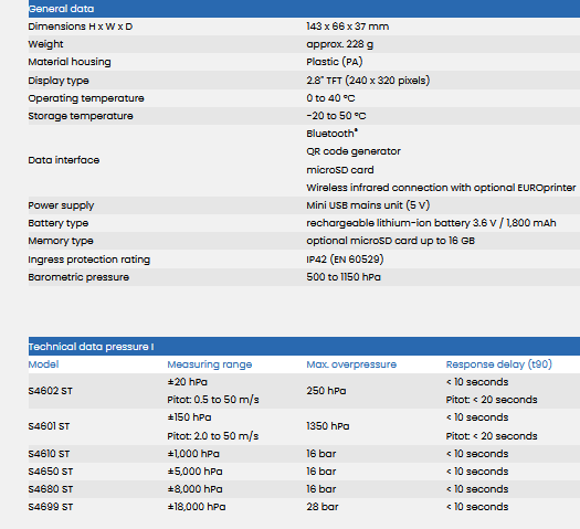The S4600 ST pressure meters use the latest data transmission technologies for easy documentation of the measured values (e.g. PDF reports). The measurement results are transferred reliably and fast to tablets, smartphones or PCs with Bluetooth® or QR code. The EuroSoft® connect App is the ideal tool when it comes to evaluating, storing and viewing the measurement results on your device. EuroSoft® connect is available for Android, iOS and Windows. In addition, the S4600 ST series instruments feature a microSD slot so that you can save your measurement results on microSD card as well.