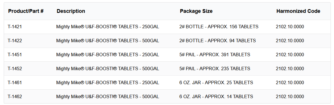 The environmentally friendly Mighty Mike U&F-BOOST Tablets used in activating in anaerobic/aerobic environments, these Billion- Onsite-Organism-Sewage-Treatment tablets by way of Bio-Augmentation, utilize over 25 billion active, robust, class 1 organisms per gram to “BOOST!” performance and consume organic material naturally in your septic tank!