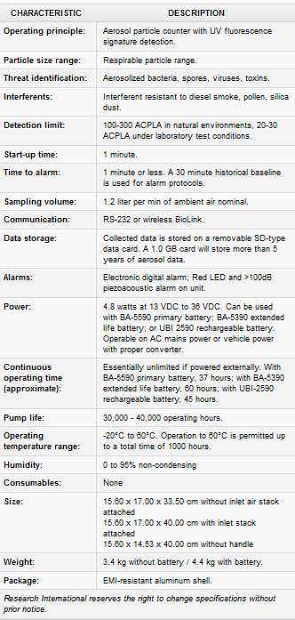 TacBio was developed by the U.S. government for military, homeland security, and public health applications. It is a compact and rugged portable biological particle detector that uses both diffractive scattering and natural biological fluorescence to monitor aerosol particulates and classify them as being of either biological or non-biological origin.