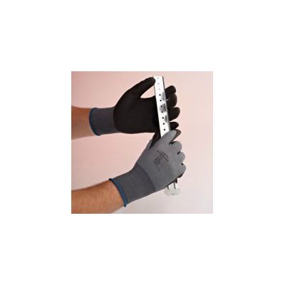 Automotive manufacturing and supply industry. Metal manufacturing and processing industry. Engineering industry and industrial maintenance. Assembly works. Building and public works. Logistics, Seamless knitted glove (gauge 13) in 100% grey texturised polyamide. Black texturised PVC coating on palm and fingertips. Elastic wrist.