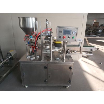 The yogurt filling and sealing machine is suitable for the production of various yogurt, jelly beverages and other products. It can automatically complete the functions of automatic dropping, filling, filling, automatic film suction, and two heat sealing of plastic (paper) cups.The yogurt cup filling machine features: 1. Suitable for paste-like materials with granular materials. 2. The filling volume and filling speed are easily adjustable, no need to replace parts, and easy adjustment. 3. The feed pipe of the equipment is equipped with a pneumatic rotary valve, which can be closed in time when the material is being filled to prevent backflow of the material during the material filling process and to provide the accuracy of the filling material. 4. The filling head is equipped with an anti-drip device, and there is no wire drawing or dripping during the filling. 5. The filling part has strong disassembly and assembly, and it can be disassembled and assembled at will for cleaning.