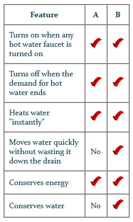 The following table compares a tankless water heater without a hot water circulation system (column A) to one with WaterQuick Tankless (column B).