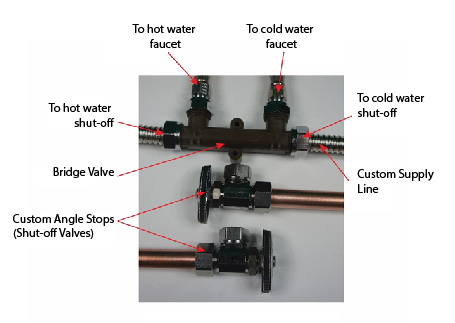 - Disconnect existing hot and cold water supply lines from the angle stops and replace angle stops with custom angle stops (see below).
