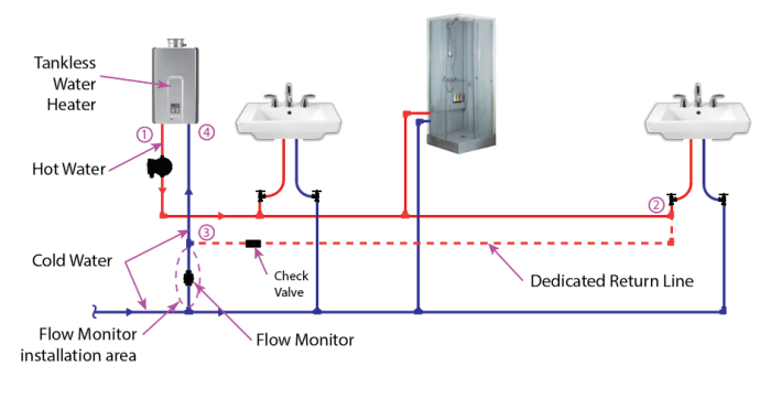 WaterQuick Tankless can be installed in several different configurations. The circulation pump andFlow Monitor can be installed in either the cold water supply line or in the hot water line going out into the house.