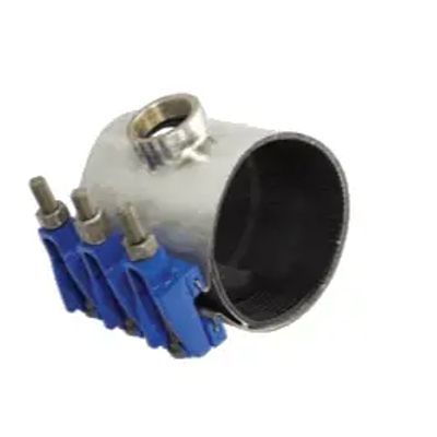 A tapped clamp to repair damaged pipe at broken or torn out service connections or branch lines. Smith-Blair Full Circle Repair Clamps consist of one or more stainless steel band sections to which cast or fabricated lugs are securely attached. The lugs accommodate bolts and nuts when mounting the clamp on pipe. Full Circle Repair Clamps have a full encirclement, tapered, overlapping, gridded gasket with a flush mounted, bonded, stainless steel bridge plate to span the band opening between the lugs. This provides a full circumferential seal on the pipe. Service connection or branch line connections.