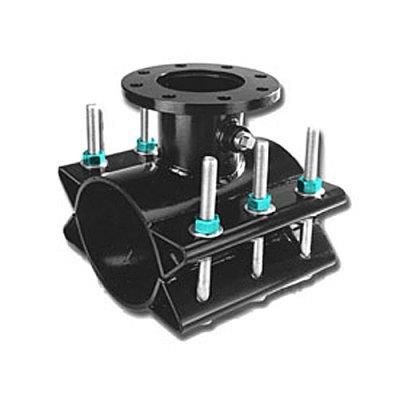 Make branch outlet connection from main supply line epoxy coated. Designed to accommodate lightweight plastic pipe. Specifically designed by Cascade for tapping and branching C900 and IPS sized PVC. The benefits of this design include specific diameter sizing to avoid ovalling of the PVC. When ordering CFT-LP’s, all sleeve part numbers reflect only diameter of pipe and show no range. On PVC, Polyethylene, thin wall and flexible pipe, the bolting torque should be a minimum of 50, maximum of 60 ft.-lbs. Model CFT-LP-ESS : CFT-LP with Epoxy Coating and Stainless Steel Bolts.