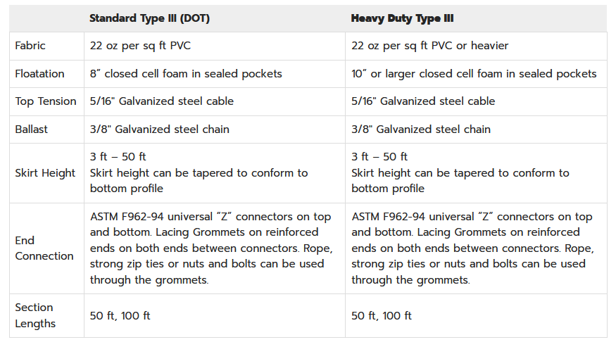 Type III turbidity curtains (also commonly referred to as Type 3 and silt curtains) are intended to control sediment and runoff in moving waters and moderate wind and wave conditions. These turbidity curtains are built with foam-filled floats that are referred to as Freeboards, combined with skirts that typically range in height from 5 to 50 feet. These floating silt curtains impede the flow of silt or sediment that may be suspended in the water.