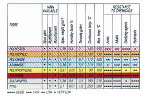 The use of fibres with different chemical and physical properties which are available in staple, multi and monofilament yarns, coupled with variations of the weave and certain specific finishing treatments,can allow for the production of fabrics suited to particular end use sand operating conditions. The table below shows the fibres on offer and some of the characteristics used in determining their uses.