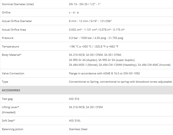 Available with threaded connections, GAS and NPT and flanged in accordance with ASME B 16.5 or EN standard is available with the following sizes: ½ “, ¾” and 1 “x 1” and set pressure up to 1500 bar. There are three orifices available to cover the different needs of pressure and capacity.